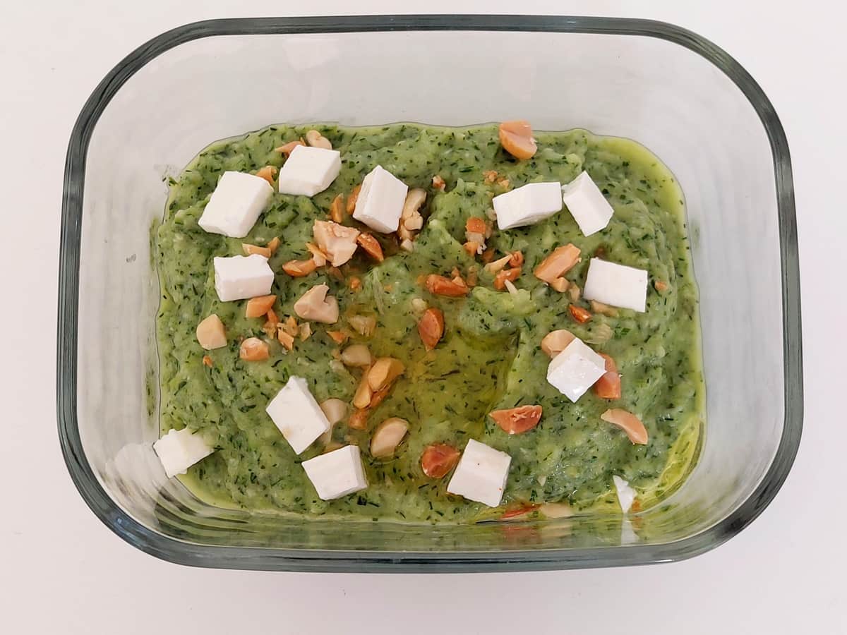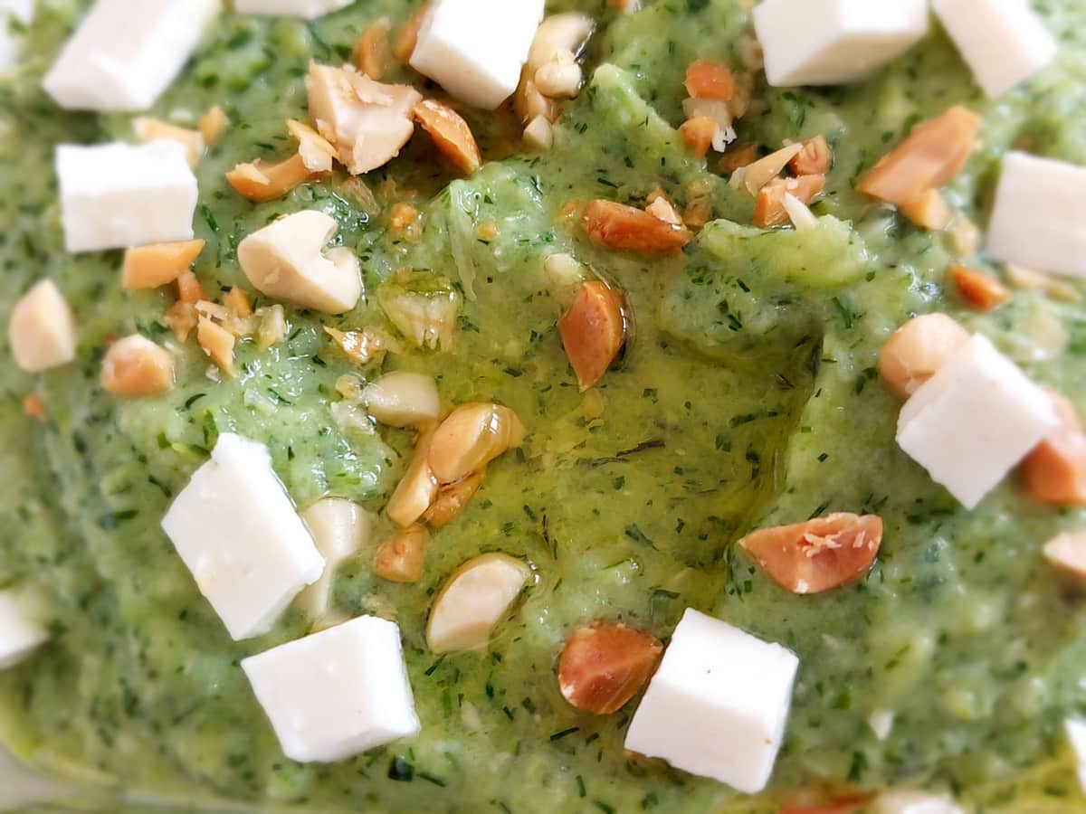 - Измельчить блендером цуккини, чеснок, тахини, оливковое масло, свежевыжатый лимонный сок, йогурт, нарезанный укроп и специи до состояния однородной пасты.