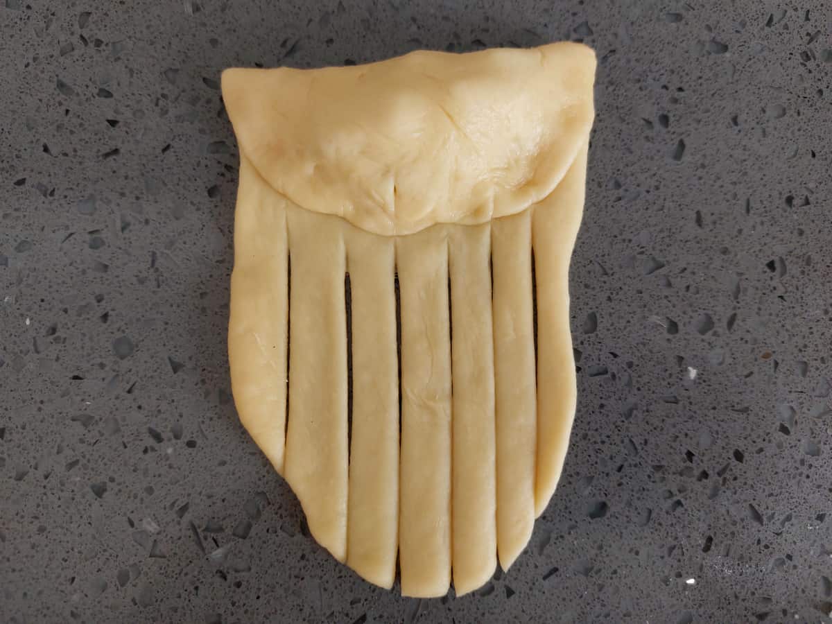 - От края начинки сделать узкие разрезы, свернуть булочку начиная от начинки к противоположному концу овального пласта.