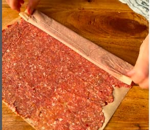 - Снять верхний лист и свернуть лист фаршем внутрь в форме плоского рулета.