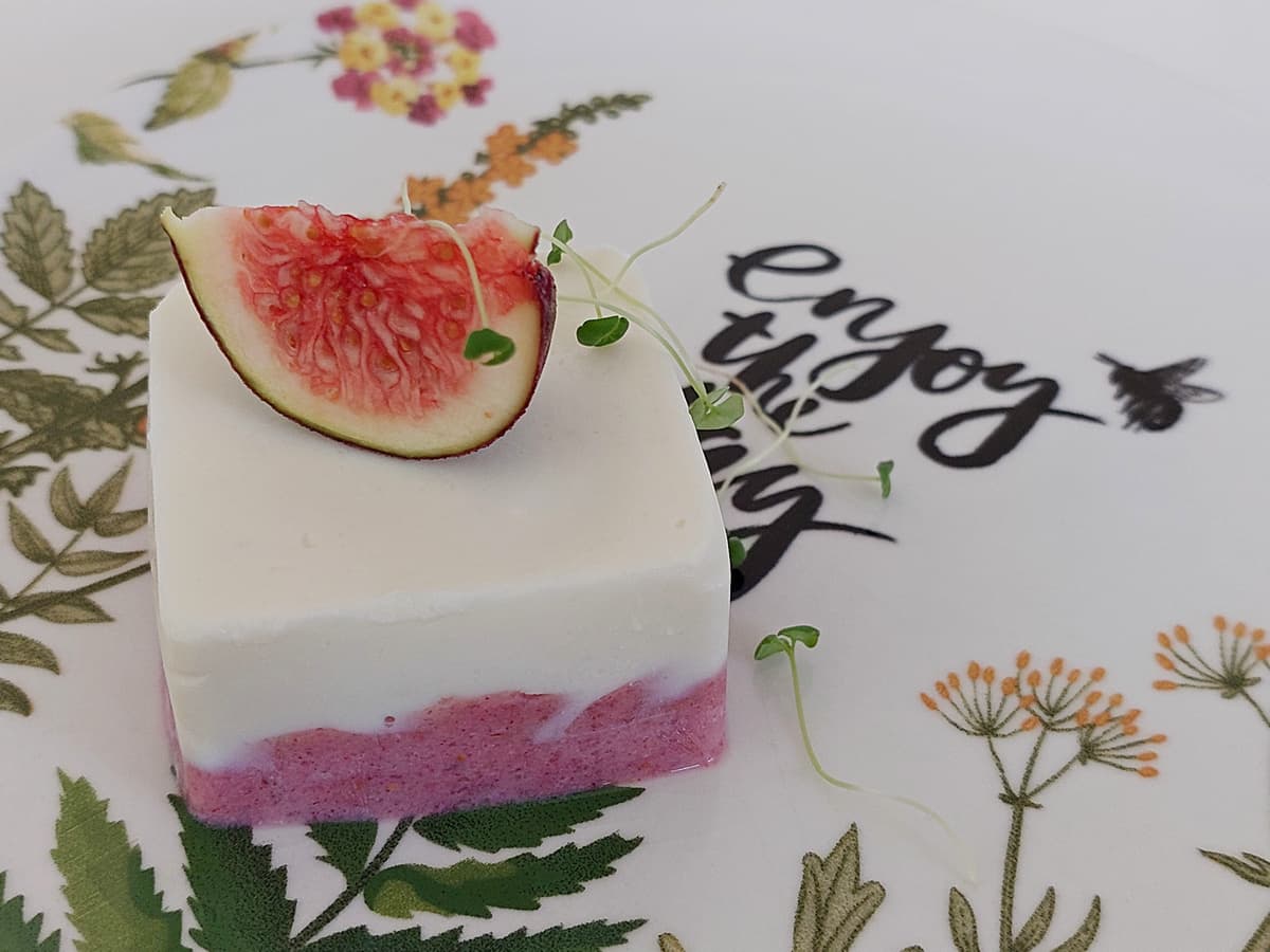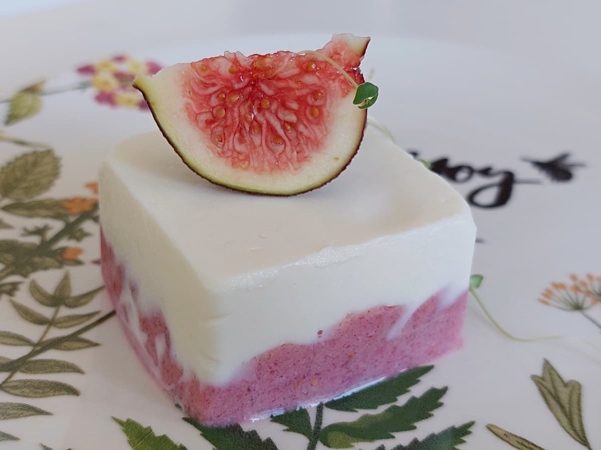 - Измельчить блендером инжир и растопленный желатин, выложить в формы поверх белого слоя.