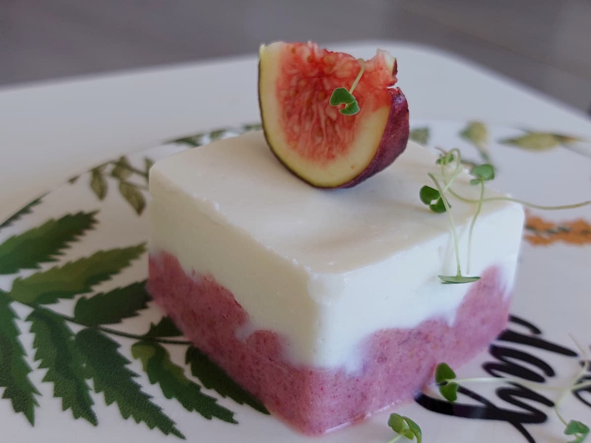 - Измельчить блендером инжир и растопленный желатин, выложить в формы поверх белого слоя.