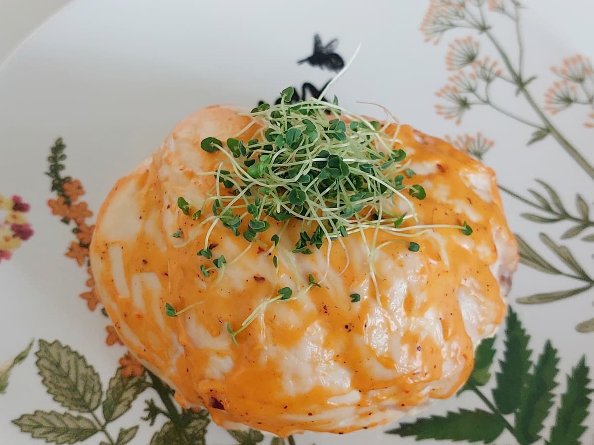 8. При подаче смазать острым соусом и украсить микрозеленью.
