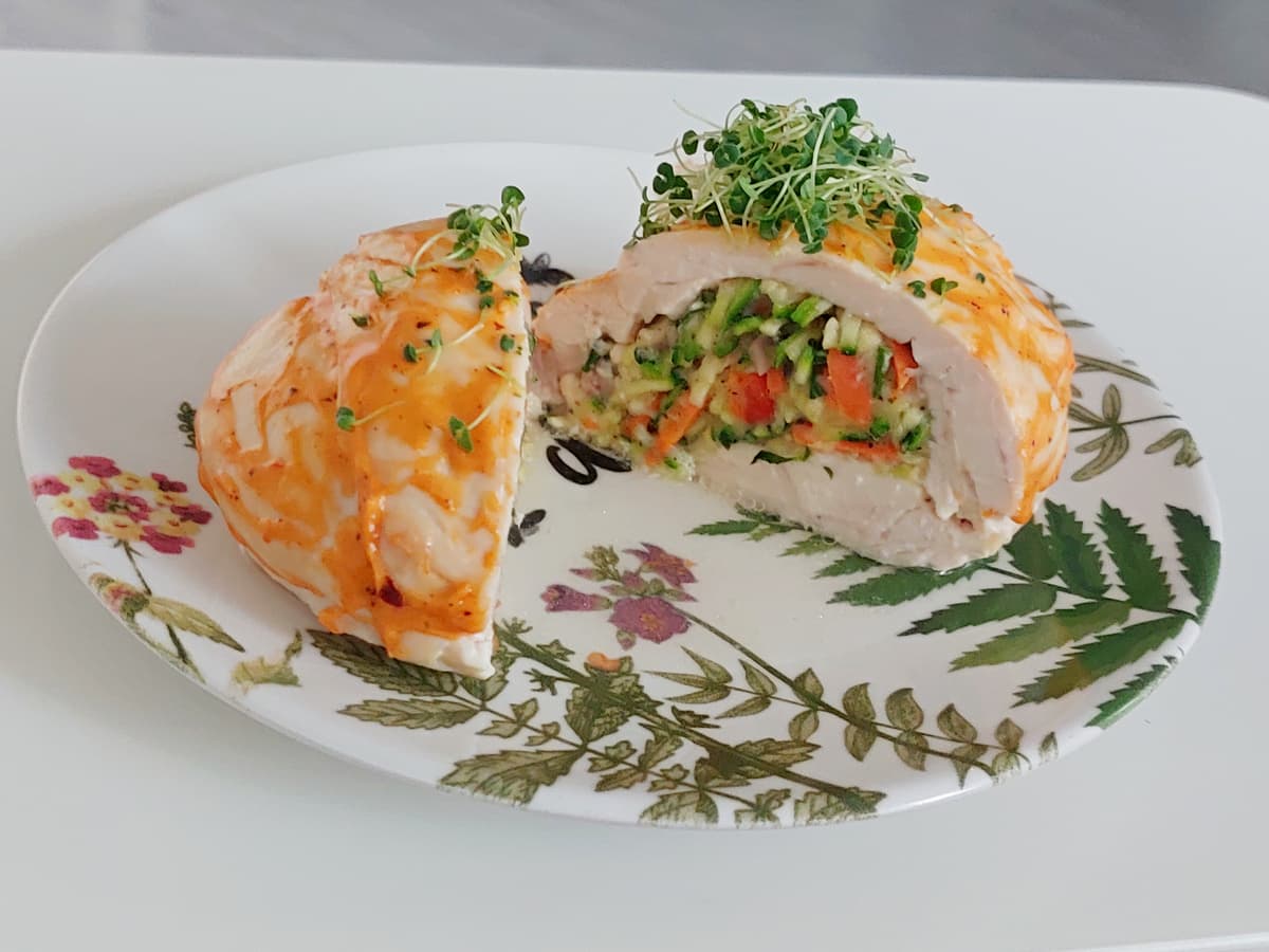 6. Аккуратно перевернуть бокал на противень, застеленный бумагой для выпечки и убрать его, стараясь чтобы фаршированное куриное филе сохранило полукруглую форму.