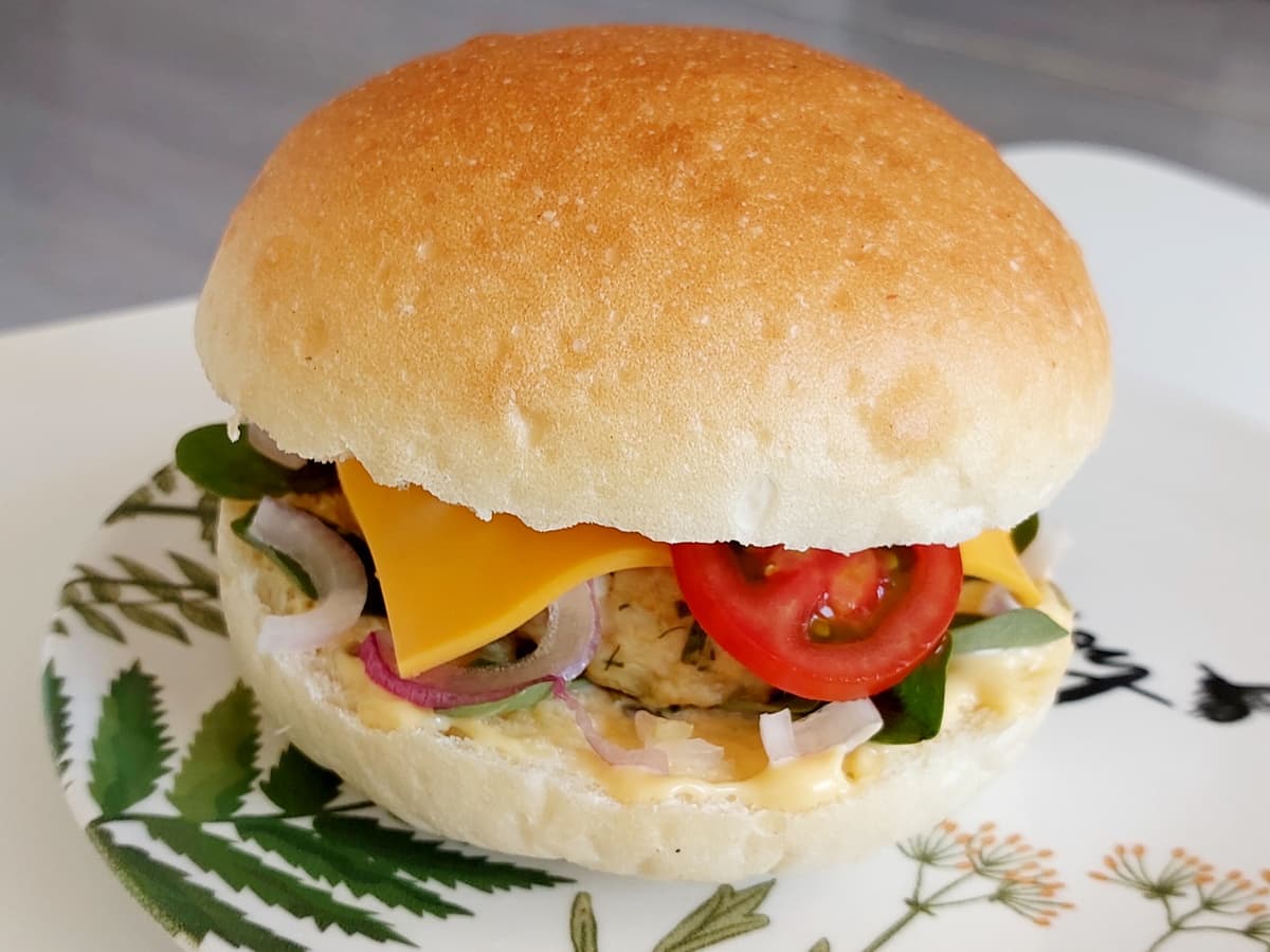 - Выложить куриные котлеты для бургера на противень, застеленный бумагой для выпечки и запекать 20 минут при температуре 200 С.