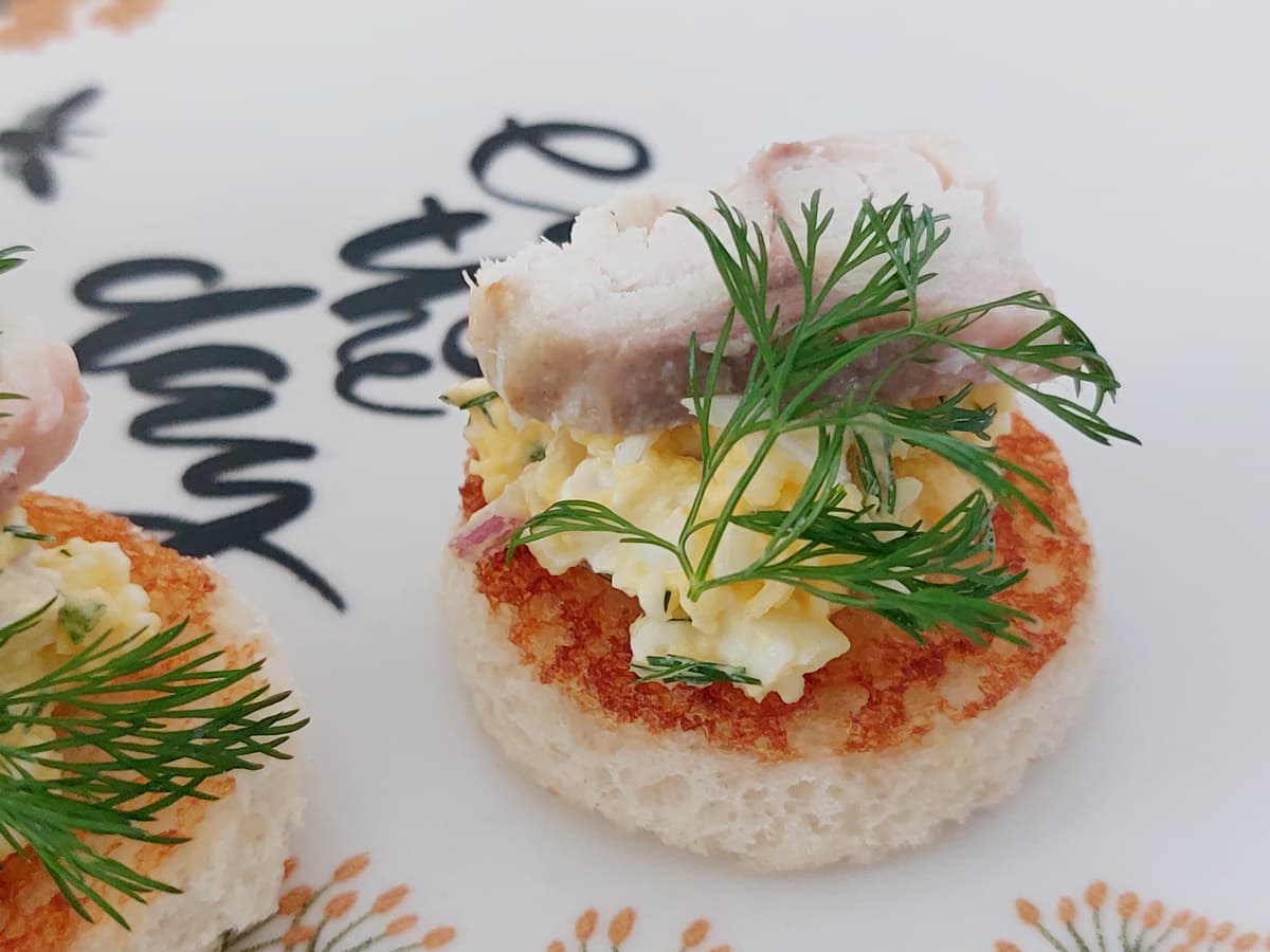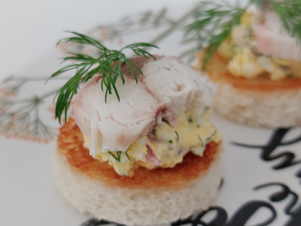 6. На канапе выложить яичный салат, украсить кусочком копченой скумбрии и веточкой укропа.