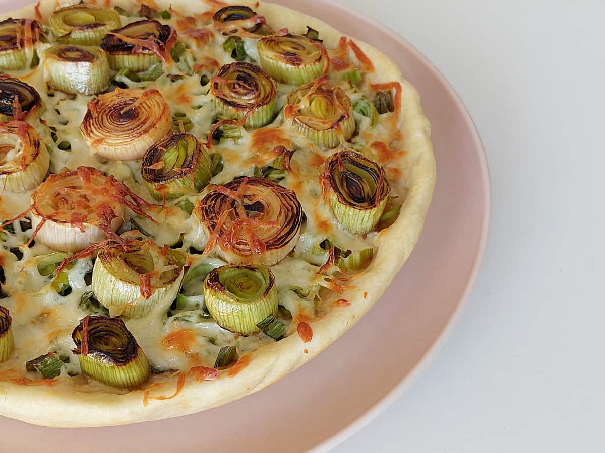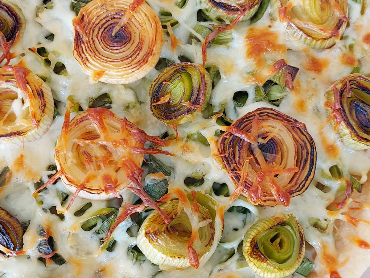 6. На сыр положить белую часть лука-порея и присыпать сыром.