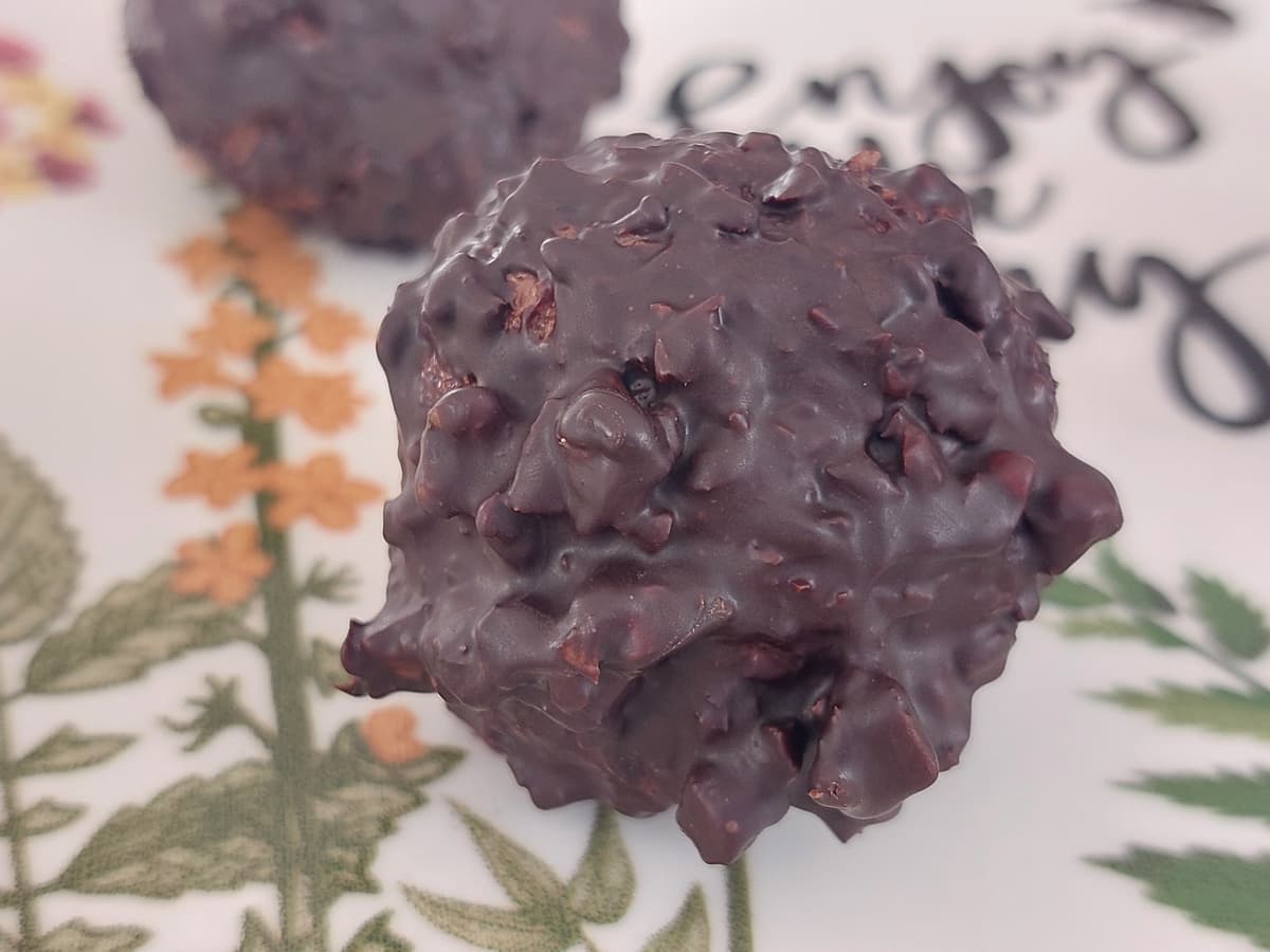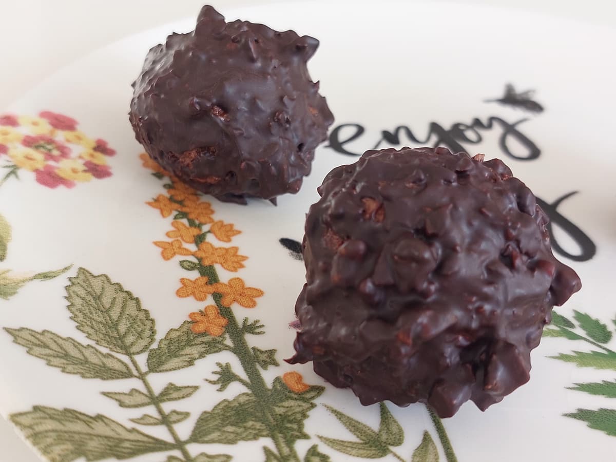 - Орехи измельчить, шоколад растопить, смешать с орехами, шарики окунуть в шоколад, охладить в холодильнике.