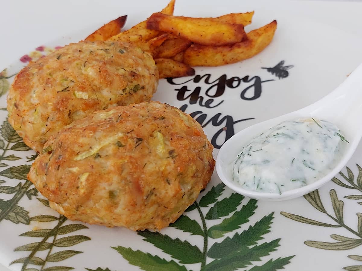 Запеченные золотистые котлеты из цукини с куриным фаршем можно подавать с соусом из йогурта с травами.