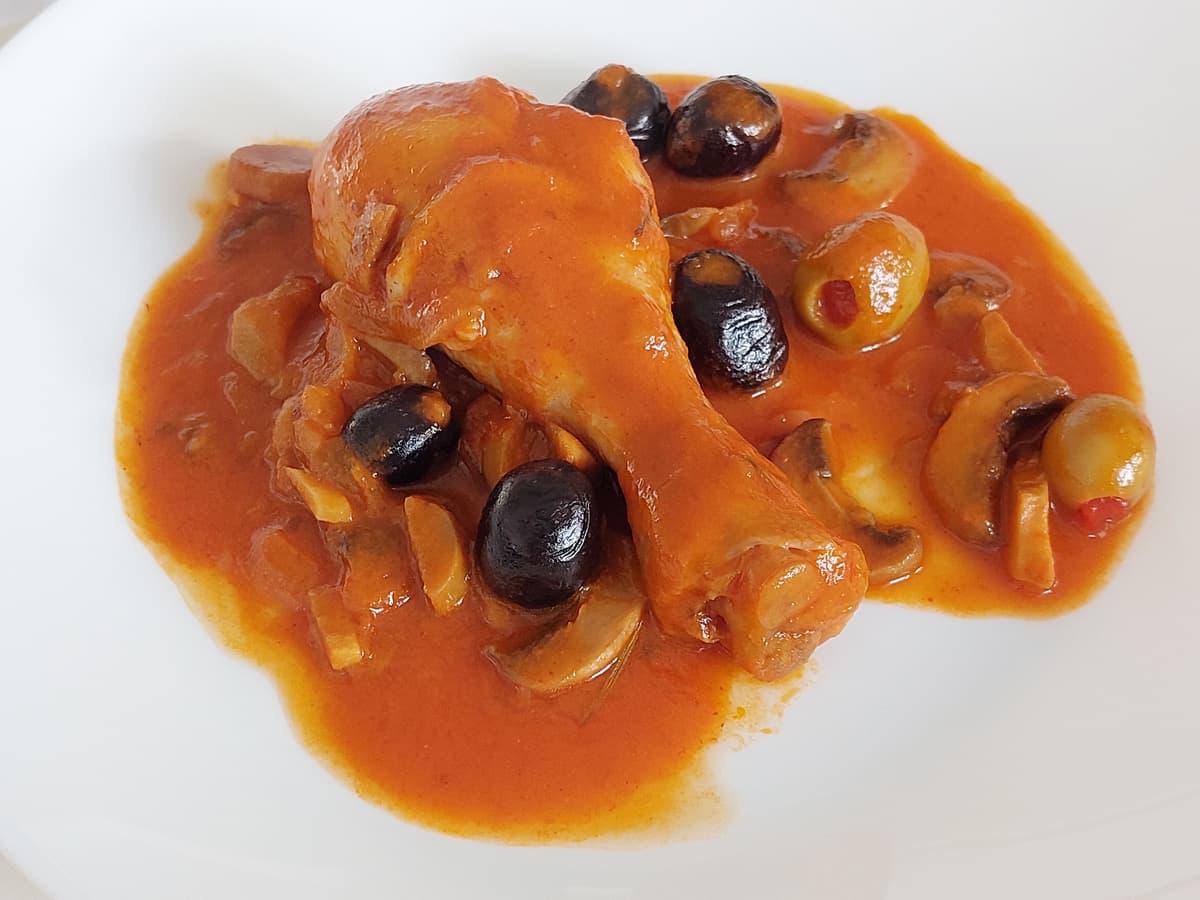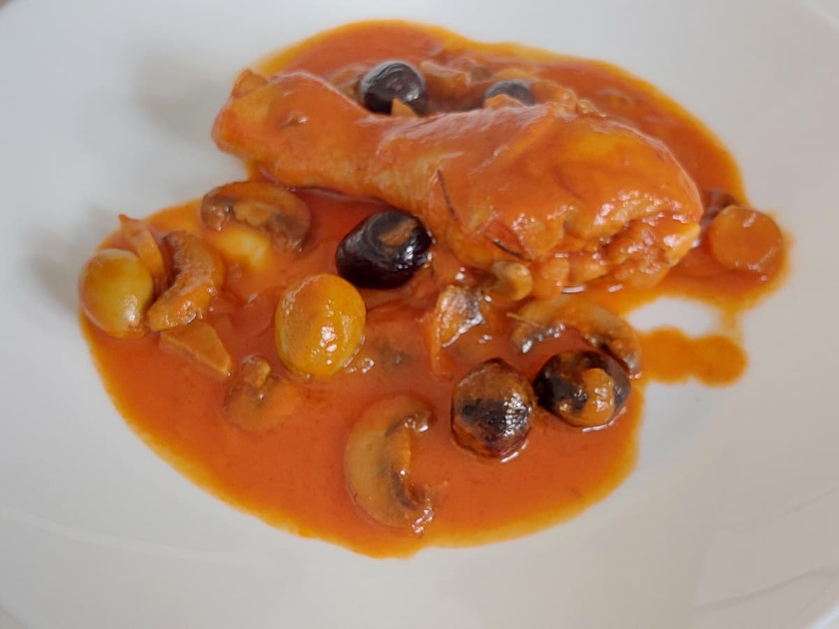- Добавить томатную пасту, оливки, лавровый лист, розмарин, накрыть крышкой и тушить на небольшом огне 35 минут или до желаемой мягкости курицы.