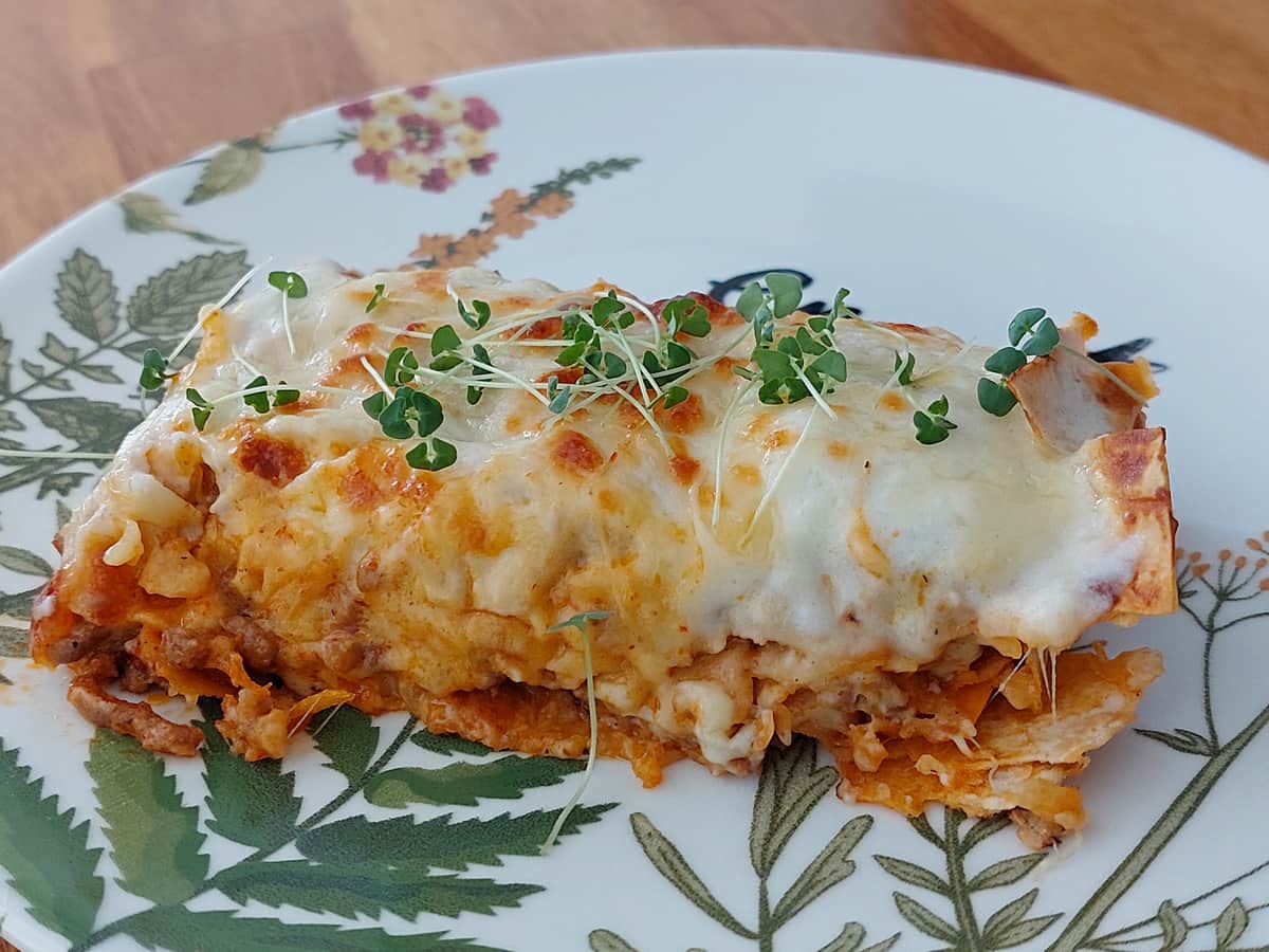 - На лаваш выложить слой фарша, полить соусом бешамель и посыпать тертым сыром. Повторить слои.