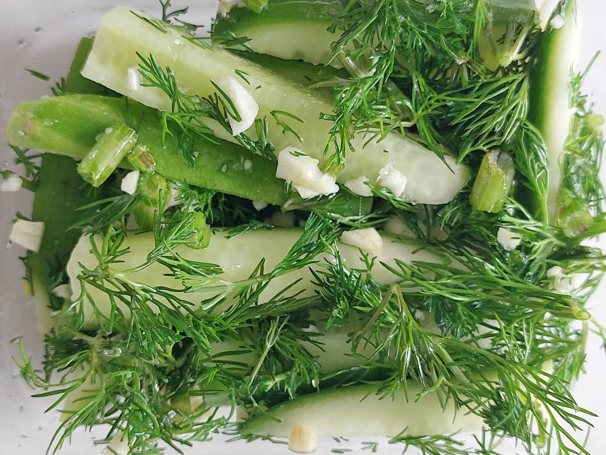 - В контейнет положить огурцы, зелень, чеснок, соль и сахар, накрыть крышкой и хорошо потрясти.