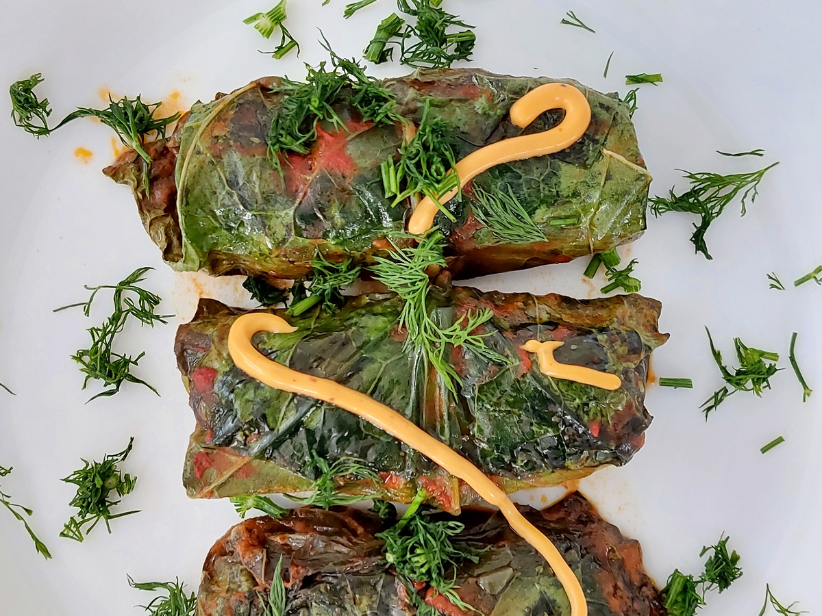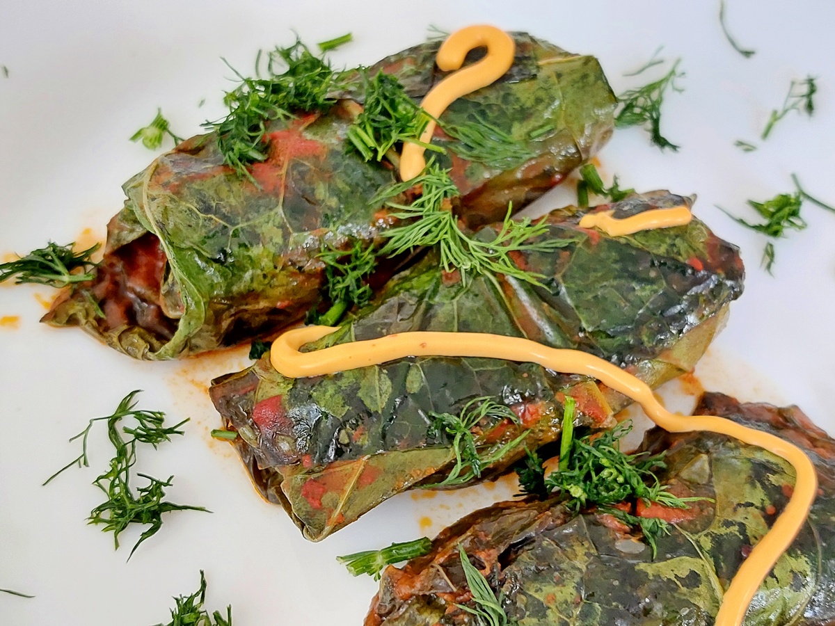 Центральная выступающая часть листа может быть грубой. Можно ее срезать, стараясь не повредить лист, сделать на ней несколько насечек или залить листы на несколько минут кипятком, чтобы они стали более мягими. Голубцы в соусе можно тушить на плите или в духовке.