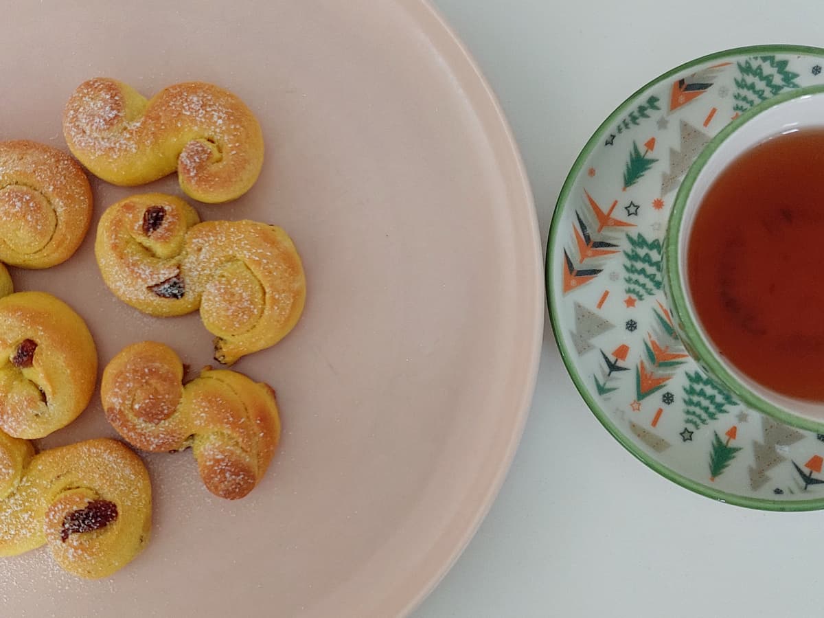 На севере Европы 13 декабря отмечают день Святой Люсии, праздник света. В Швеции, Норвегии и некоторых регионах Дании в честь празника едят традиционную выпечку с шафраном. У этого десерта есть много названий — Lussebullar, saffransbullar, Lussekatter. Эти булочки популярны так же в дни Адвента. Я заменила шафран порошком куркумы.