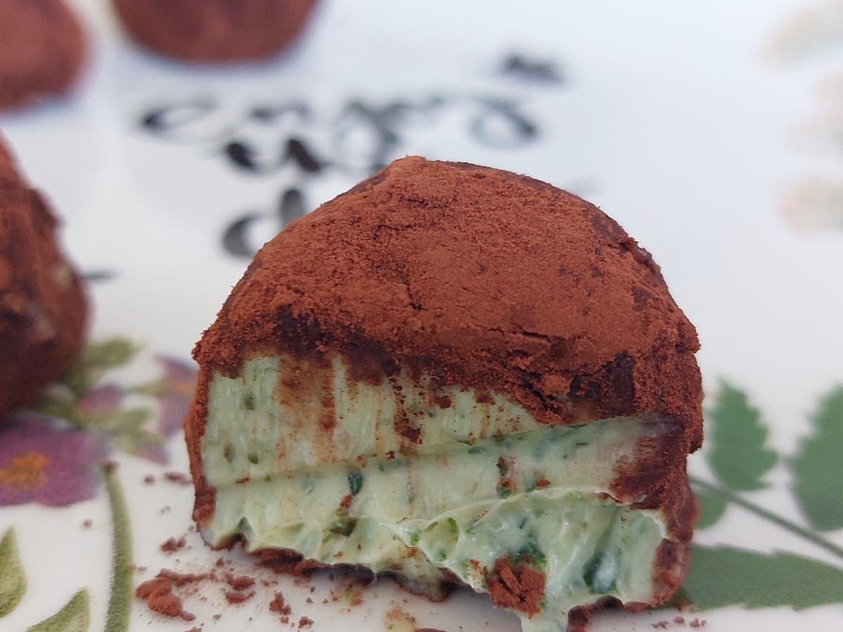 Можно все листья мяты использовать для ароматизации сливок, потом их отжать и убрать. Но тогда ганаш не будет иметь красивый светло-зеленый цвет. Я пробивала блендером все листья, включая те, что нагревались в сливках для ароматизации. Я не накрываю ганаш пленкой, а использую крышку. Лучше если это будет герметичный контейнер в случае хранения более 2 часов перед использованием.