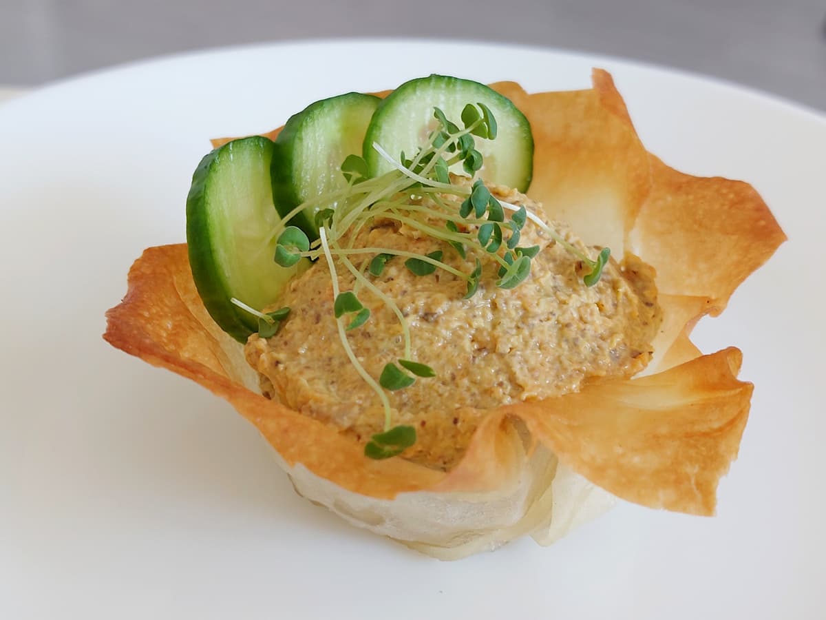Подавать паштет можно в корзиночках из теста фило, на крекерах или на тостах.