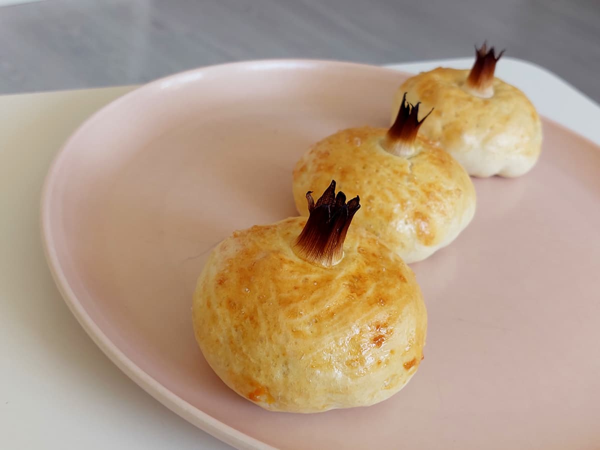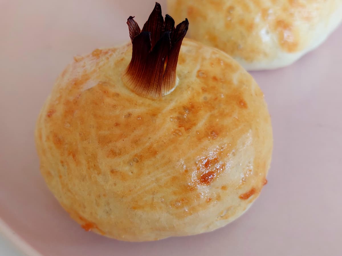 12. Выложить пирожки швом вниз на противень, застеленный бумагой для выпечки, смазать желтком, сверху каждого пирожка поставить кусочки лука-порея так, чтобы пирожки стали похожи на плод граната.