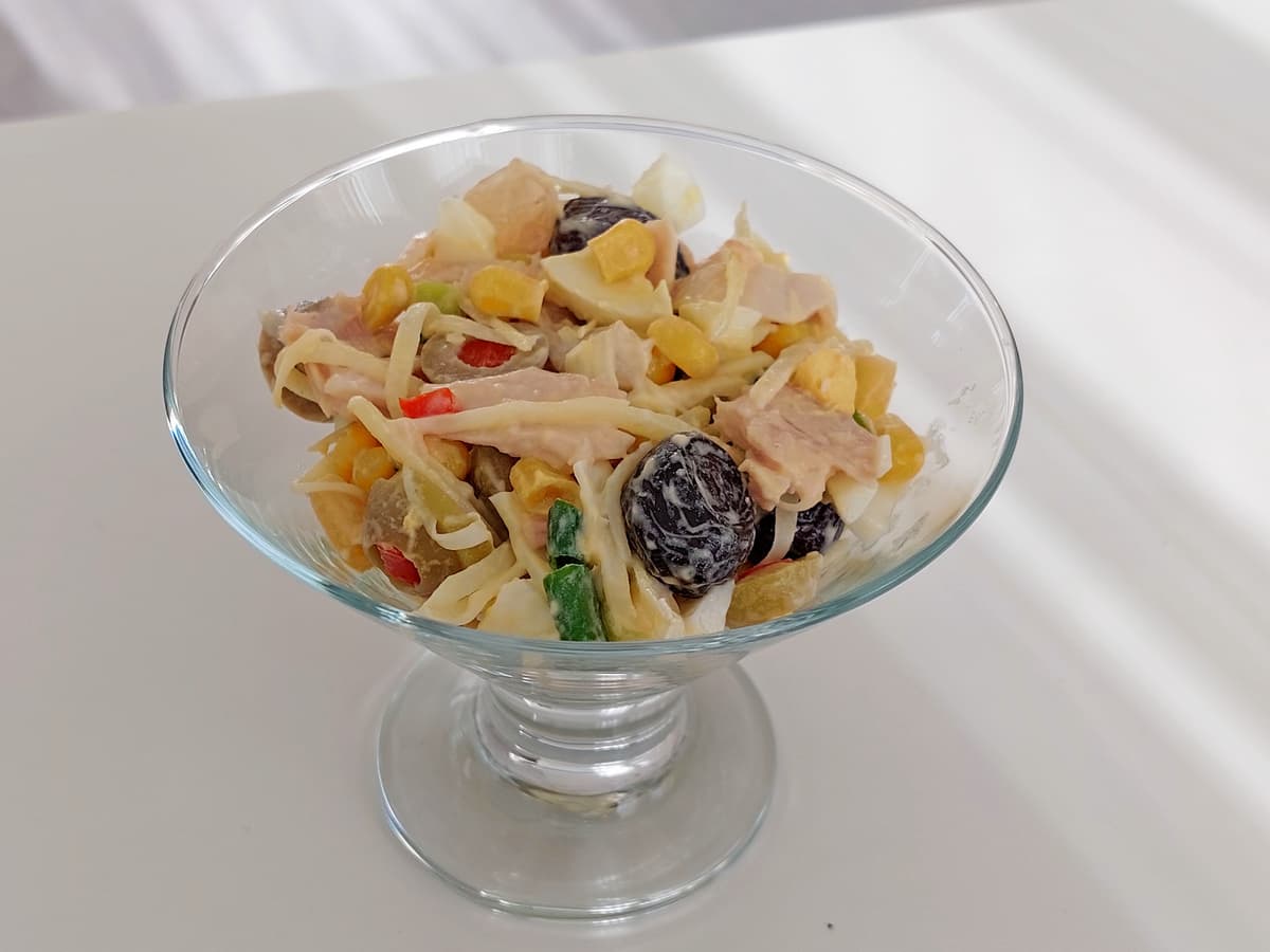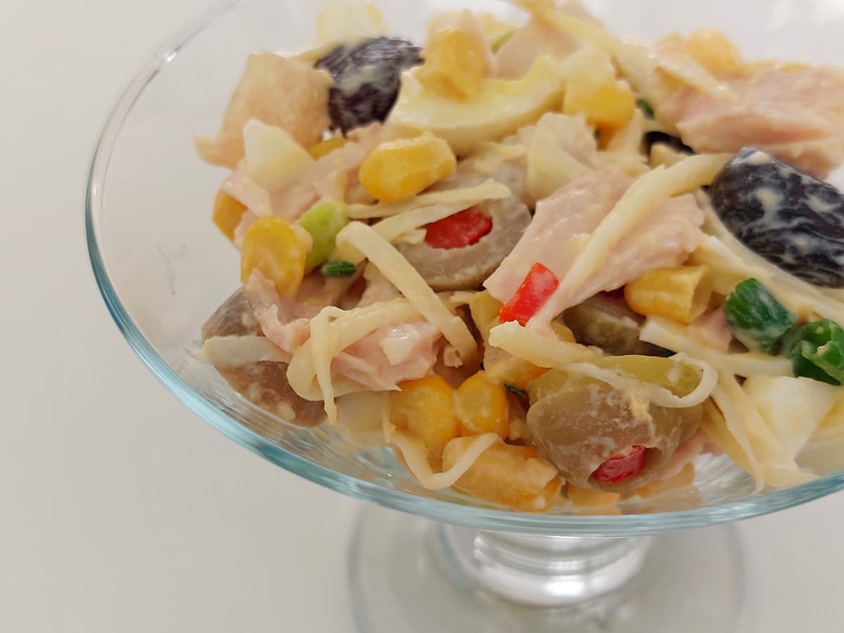 4. Смешать курицу, кукурузу, оливки, сыр, зеленый лук, заправить салат майонезом, перемешать.