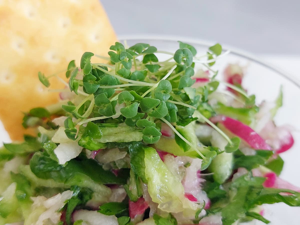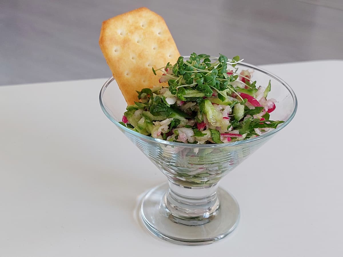 - Выложить салат в бокал, украсить крекером и микрозеленью.