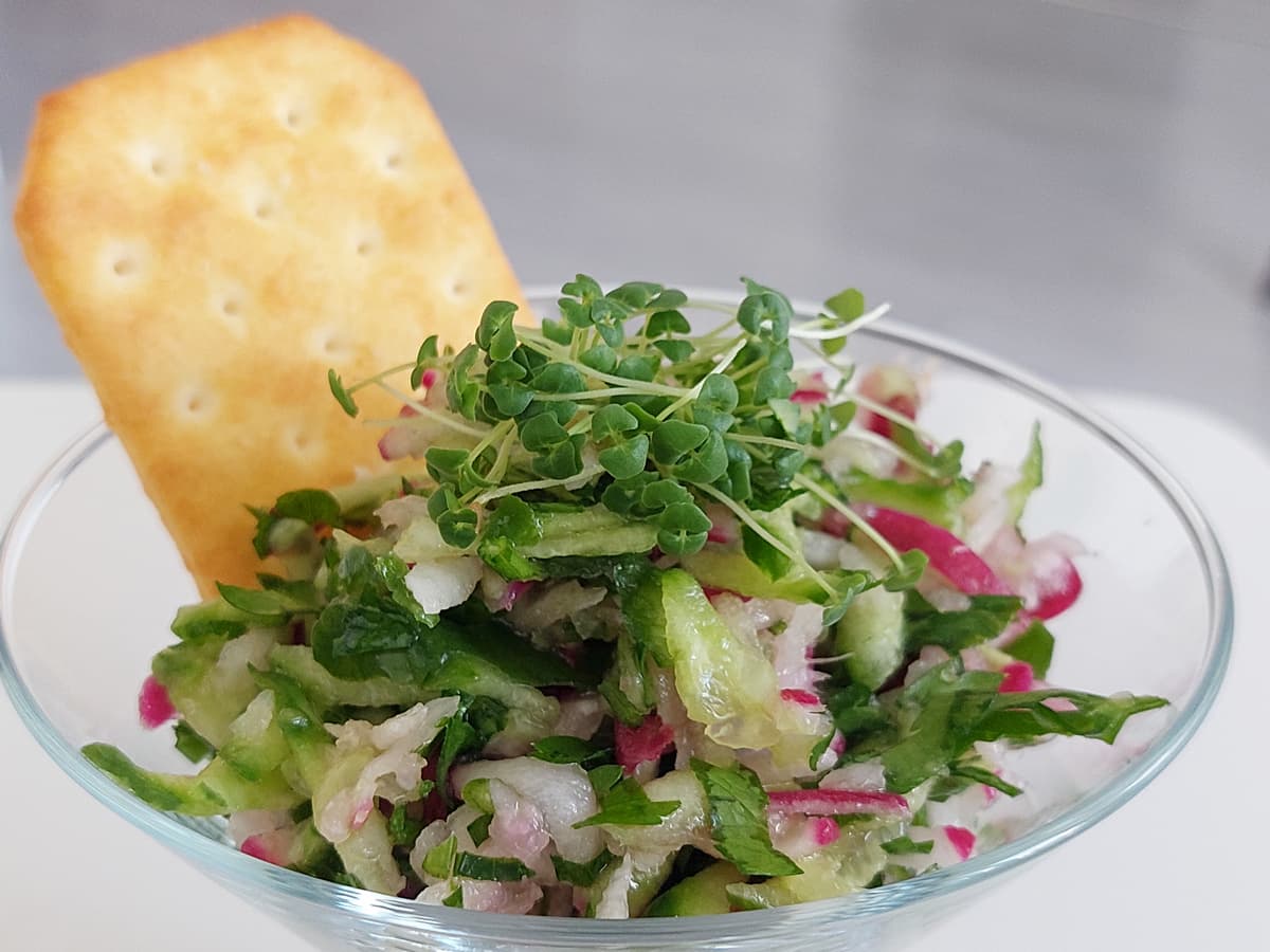- Выложить салат в бокал, украсить крекером и микрозеленью.