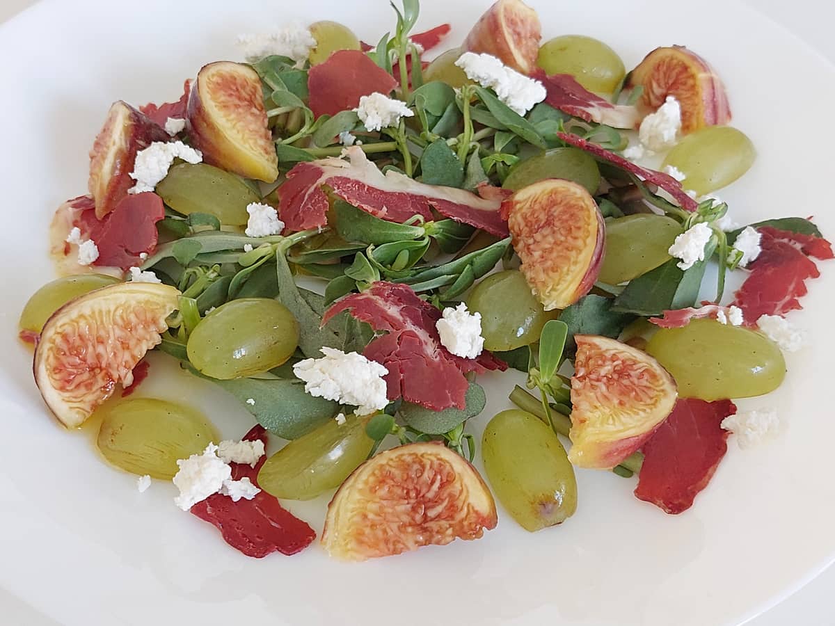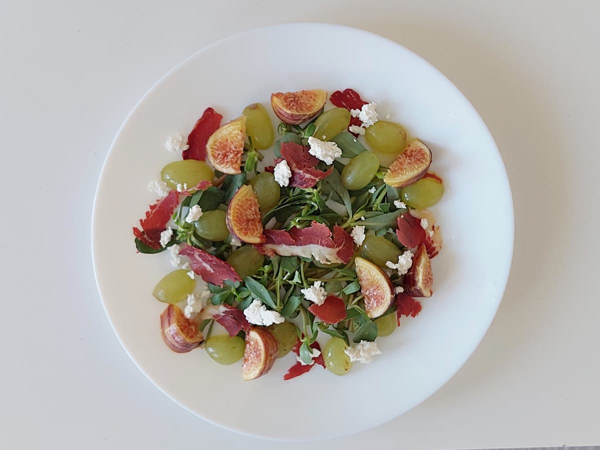 - Инжир, ягоды винограда без косточек и хамон выложить поверх кресс-салата, рикотту раскрошить и посыпать салат.