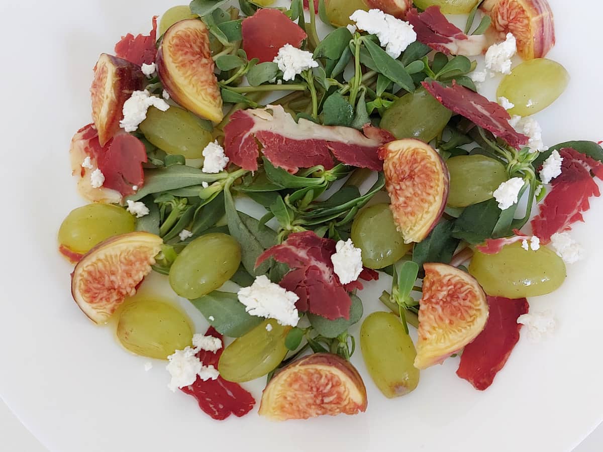 - Инжир, ягоды винограда без косточек и хамон выложить поверх кресс-салата, рикотту раскрошить и посыпать салат.