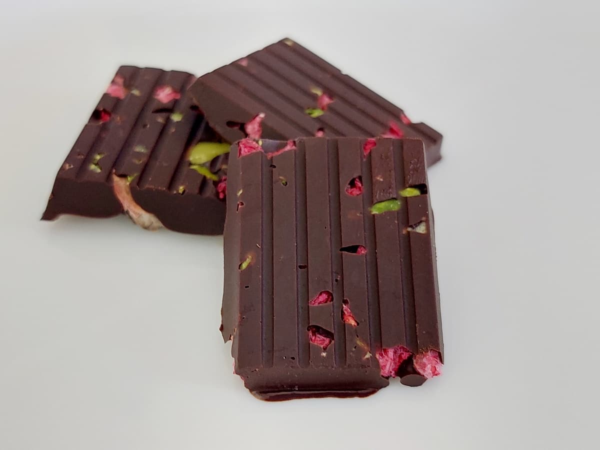 С помощью добавления фисташек и малины обычный шоколад можно превратить в изысканный десерт.