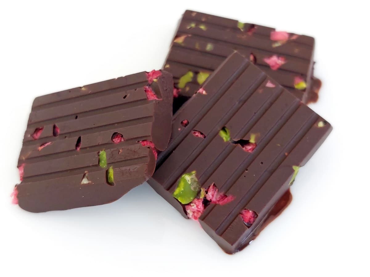 С помощью добавления фисташек и малины обычный шоколад можно превратить в изысканный десерт.