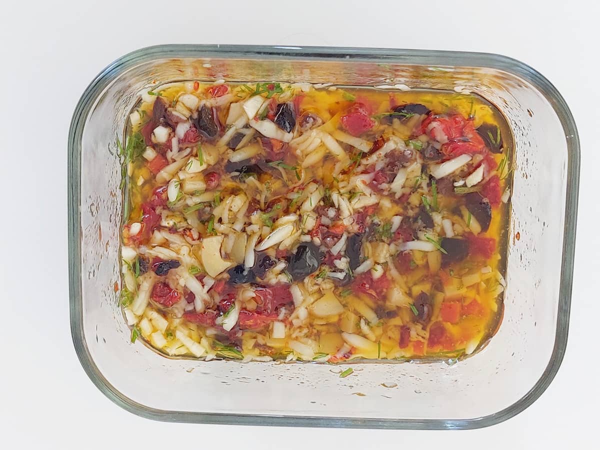 - К оливковому маслу добавить бальзамический уксус, сыр, оливки, вяленые помидоры, чеснок, цедру, стравы и специи, хорошо перемешать.