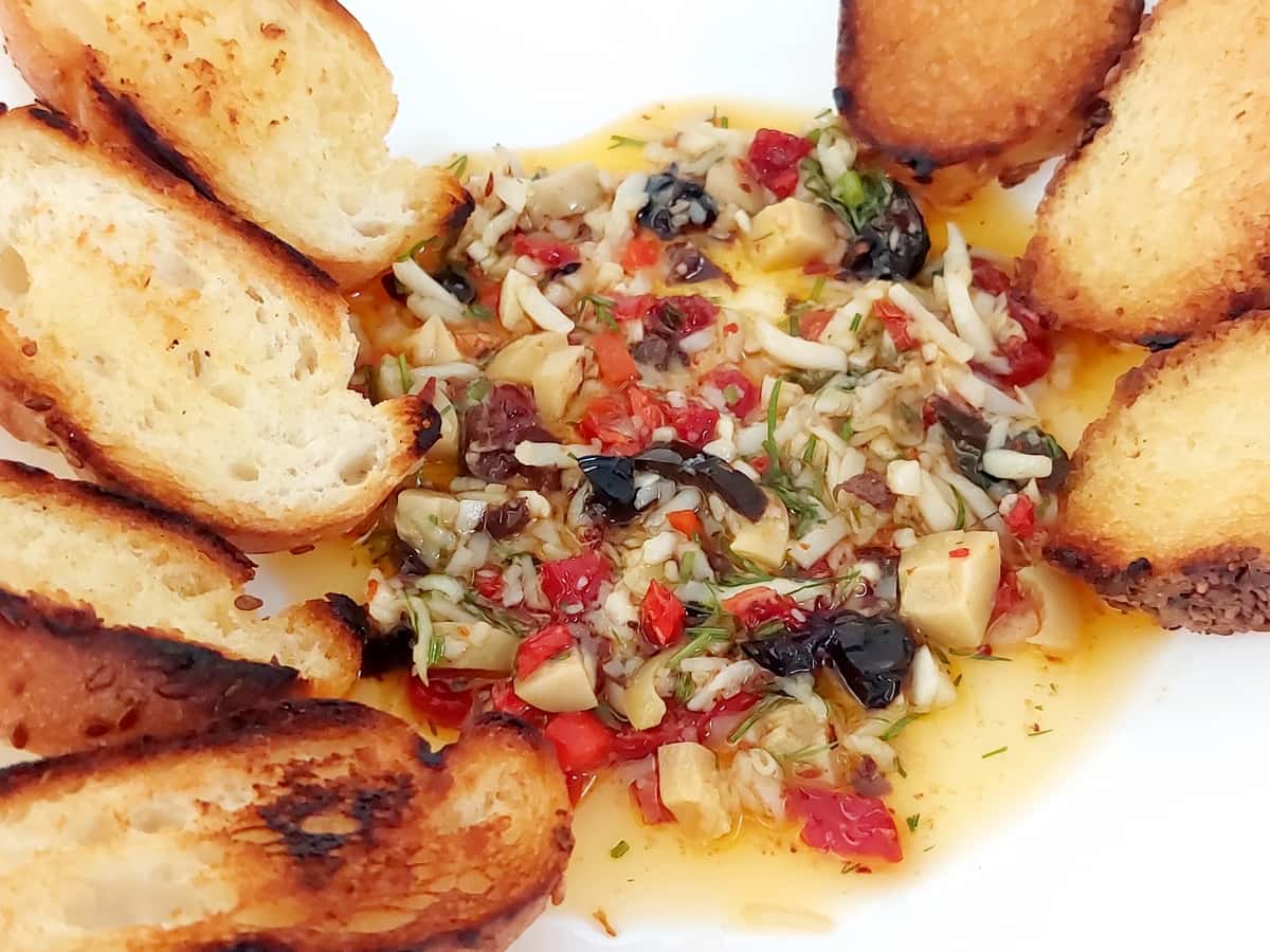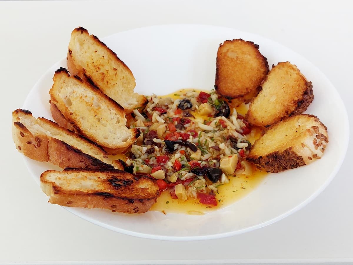 - Переложить смесь в сервировочную миску и подать с ломтиками поджаренного багета.