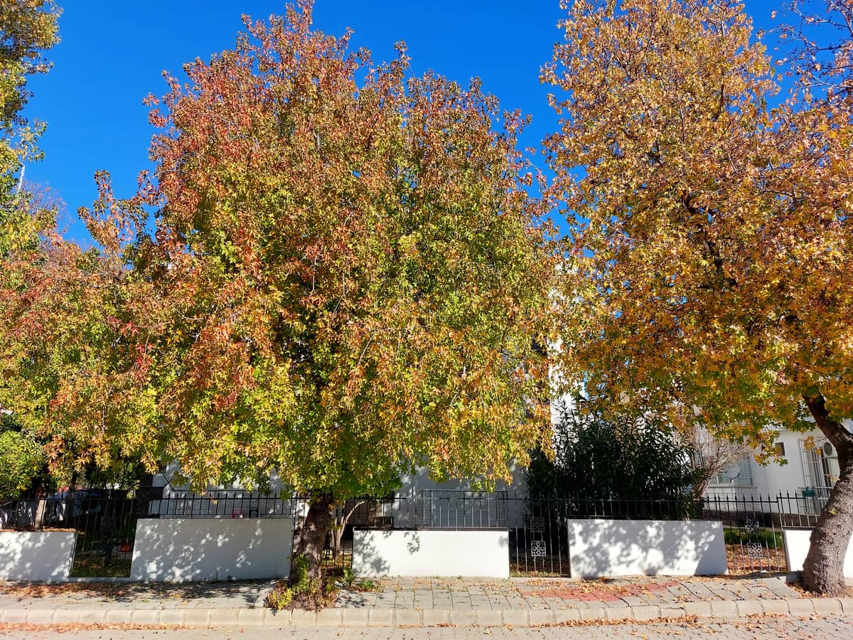 Осень. Кроны некоторых деревьев окрашиваются в желтые и красные оттенки, а под ногами шуршат листья.