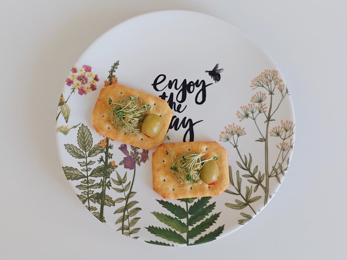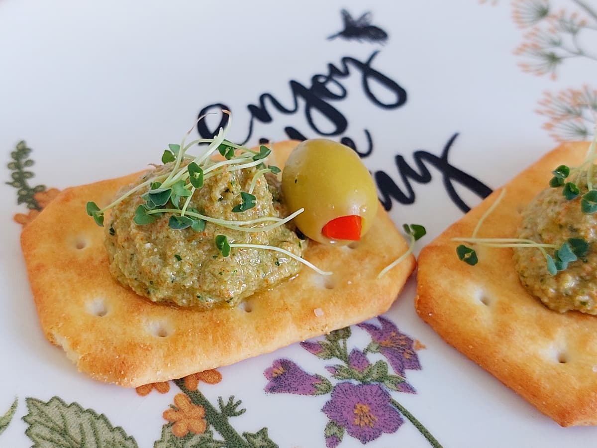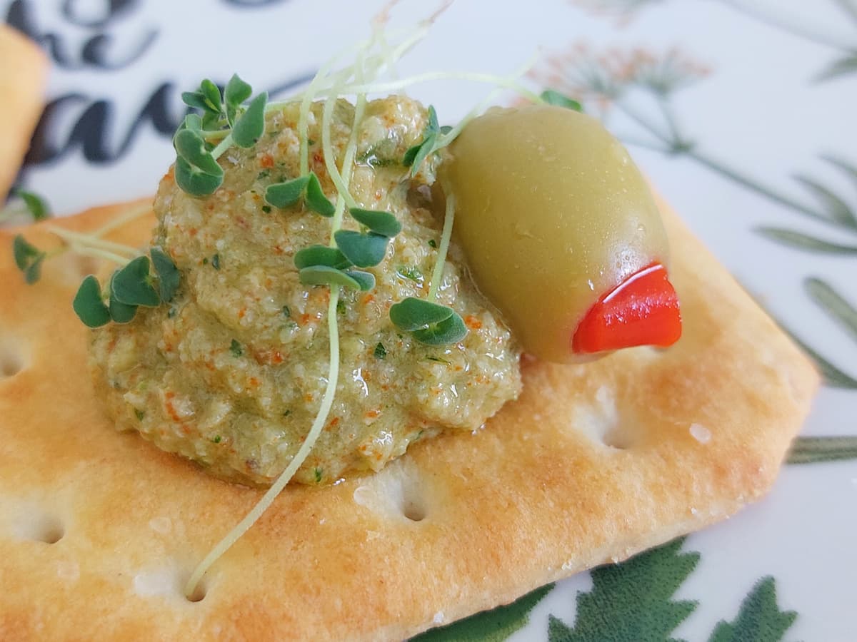 2. Подавать тапенаду на крекерах, украсив зелеными оливками.