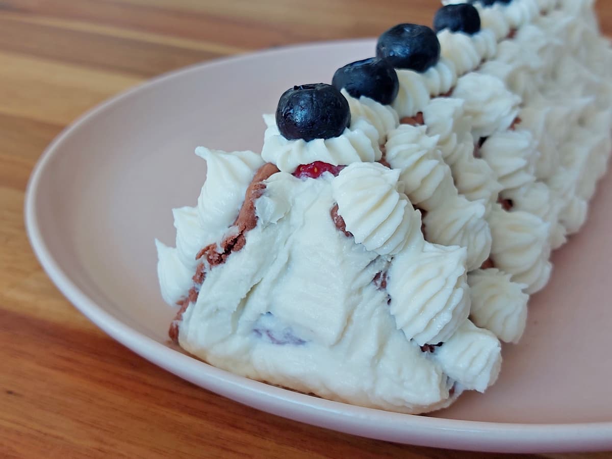 - Украсить верх торта кремом и ягодами голубики.
