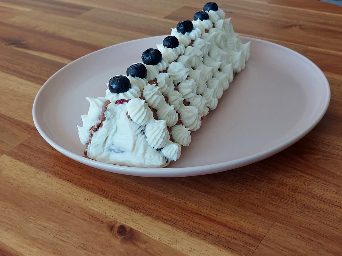 - Взбить рикотту, сливки и сахар до состояния крема, с помощью кулинарного мешка выложить слой крема на печенье.