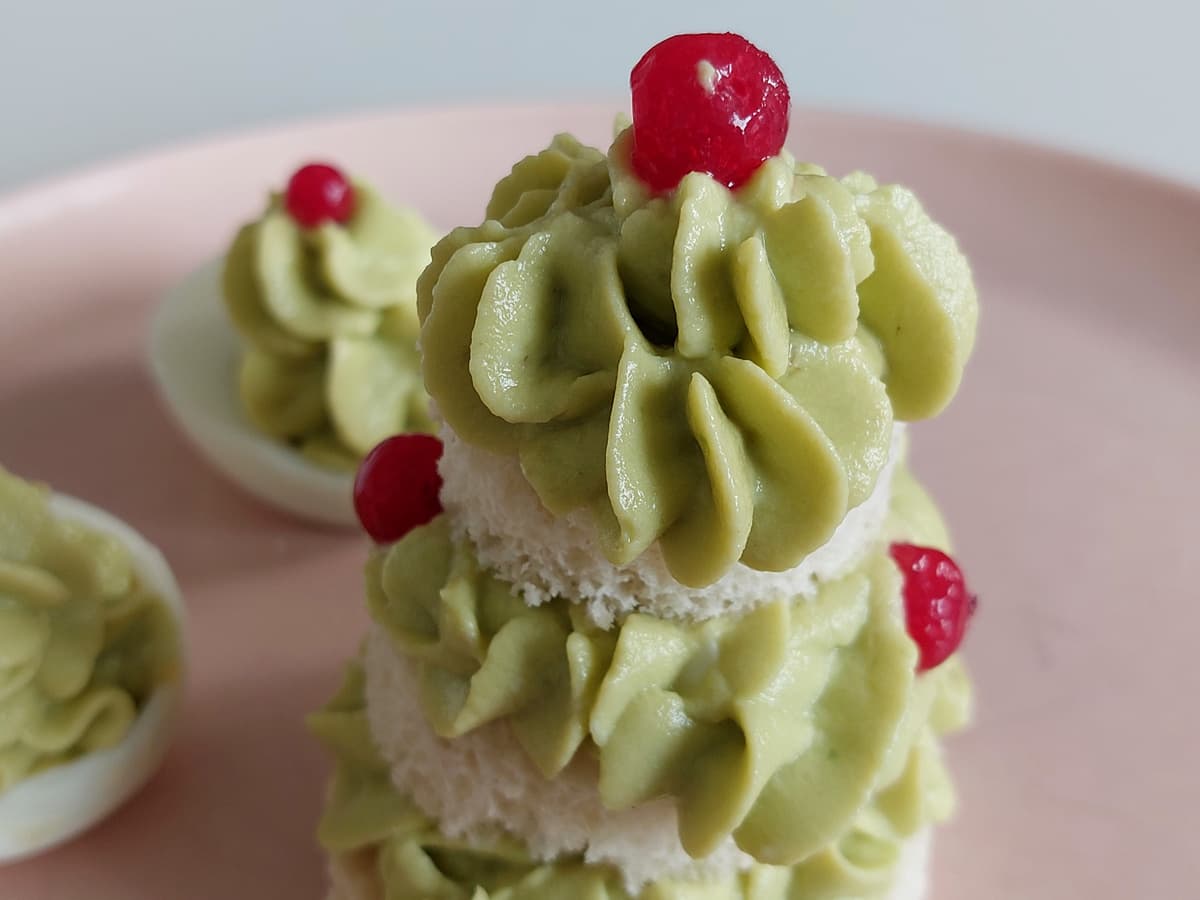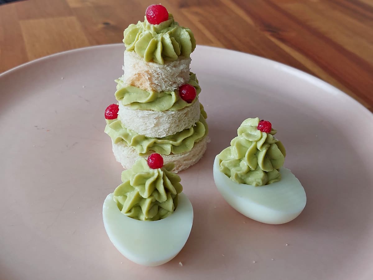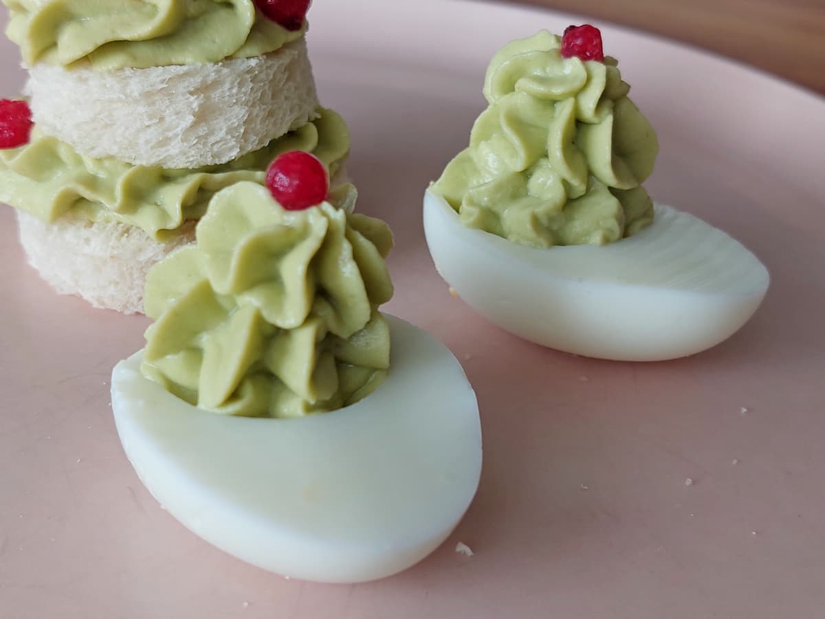 Мусс из авокадо получается очень пластичный. Им можно украшать другие закуски, например выложить его в форме елки на половинку яйца.