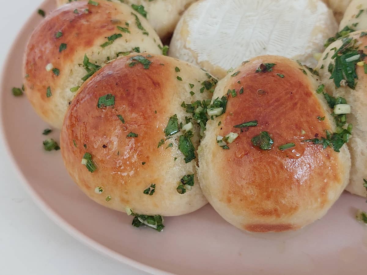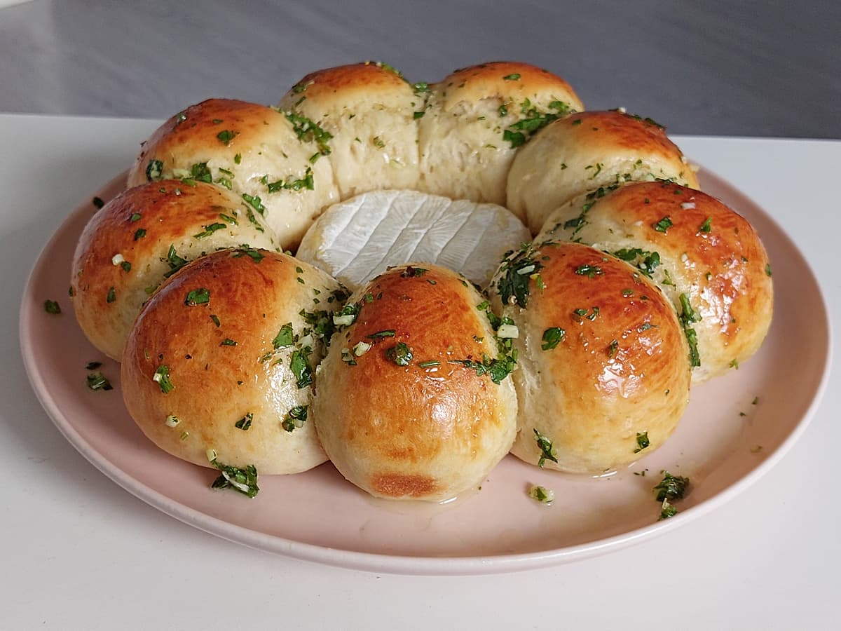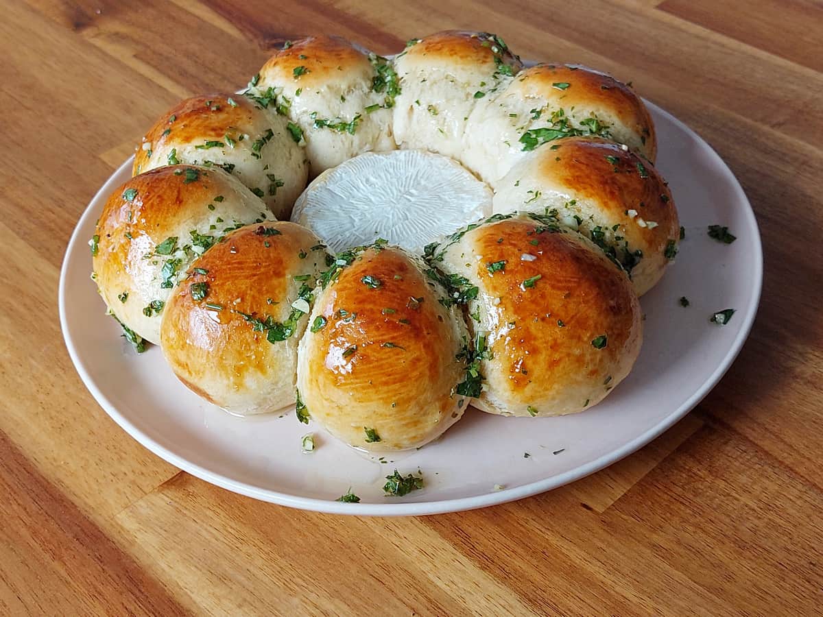 - Аккуратно переложить сыр и кольцо из булочек на блюдо, смазать смесью масла, зелени и чеснока.