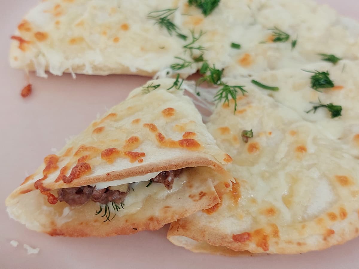 - Лаваш разрезать пополам, визуально разделить половинку на три треугольника, средний треугольник смазать крем сыром, на него положить фарш, свежий укроп, тертый сыр и загнуть края с двух сторон в нахлест так, чтобы получился треугольник.