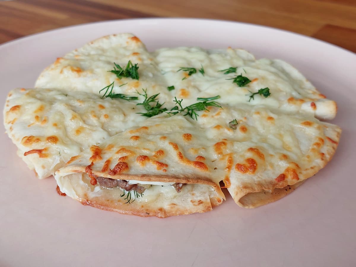 - Лаваш разрезать пополам, визуально разделить половинку на три треугольника, средний треугольник смазать крем сыром, на него положить фарш, свежий укроп, тертый сыр и загнуть края с двух сторон в нахлест так, чтобы получился треугольник.